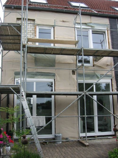 Bei fehlender Wärmedämmung der Außenhaut eines Hauses werden Dämmplatten in verschiedenen Verfahren mit Armierungsputzen und -gewebe angebracht. Im Anschluss kann die fertige Oberfläche wahlweise mit einem Außenputz oder Klinkeriemchen versehen werden.